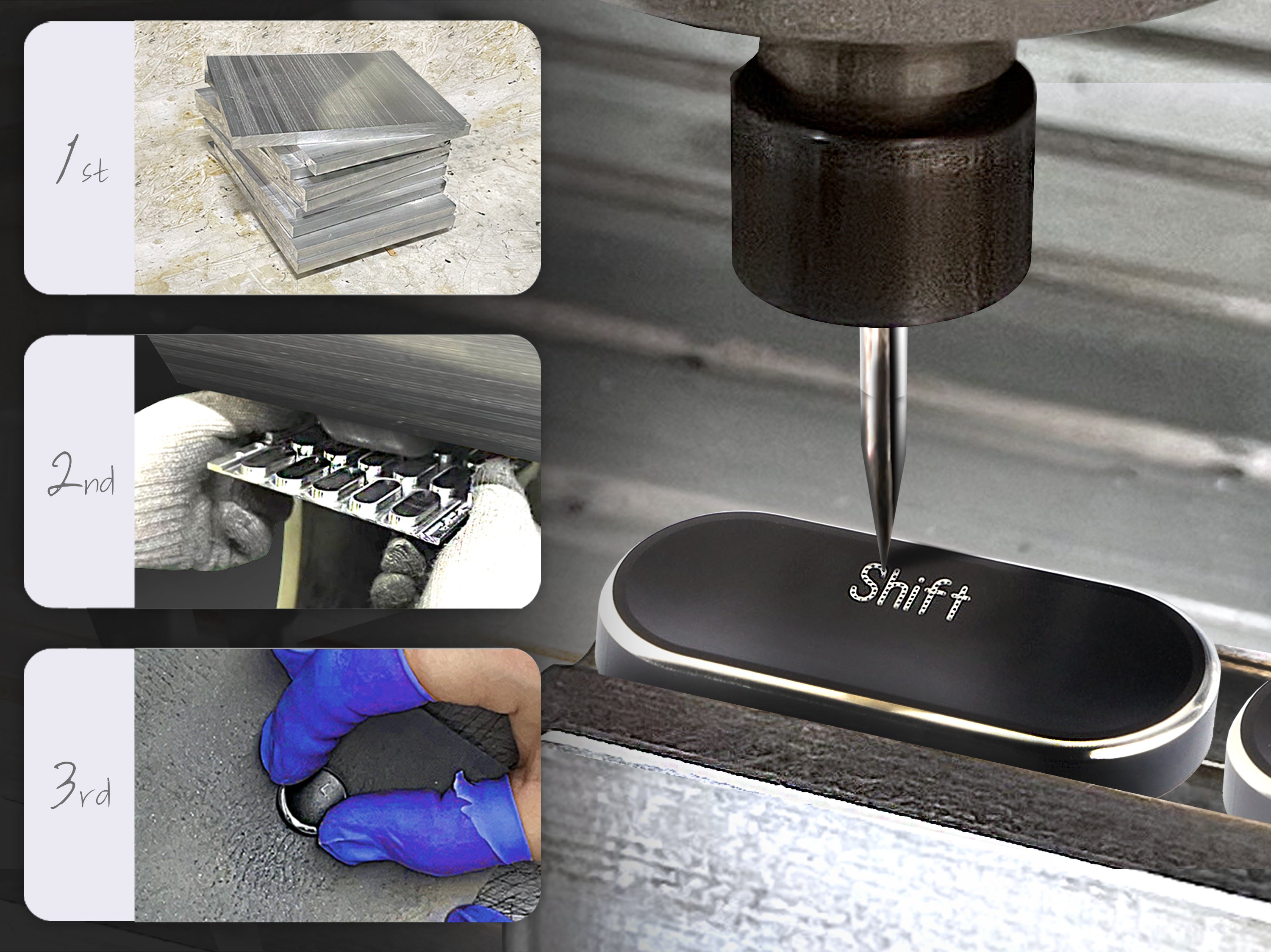 Using a diamond-coated tool, the edges of aluminum keycaps are cut to round them off and enhance their sparkling appearance.
