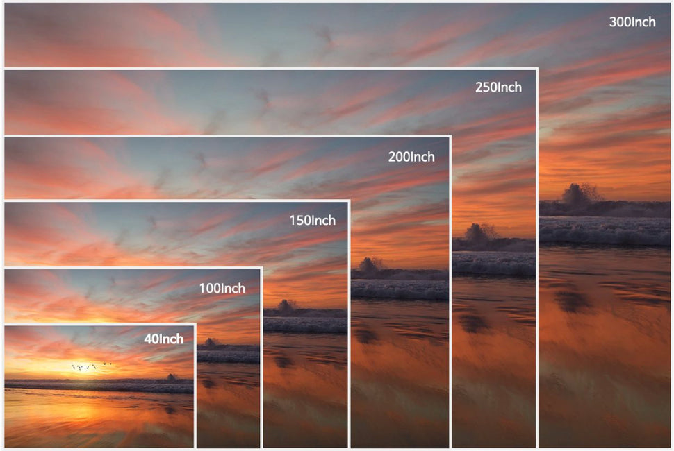 The screen of the projector is from a minimum of 40 inches to a maximum of 300 inches.Enjoy a full size movie on a 6.5m (21ft) wall.